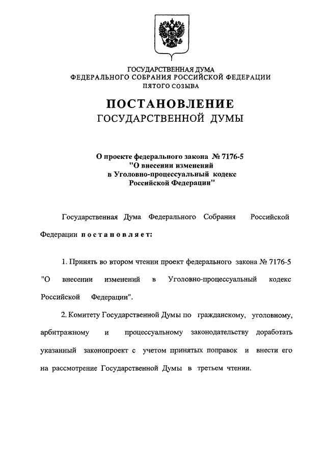 "О ПРОЕКТЕ ФЕДЕРАЛЬНОГО ЗАКОНА N 7176-5 "О ВНЕСЕНИИ ИЗМЕНЕНИЙ В УГОЛОВНО - ПРОЦЕССУАЛЬНЫЙ КОДЕКС РОССИЙСКОЙ ФЕДЕРАЦИИ"