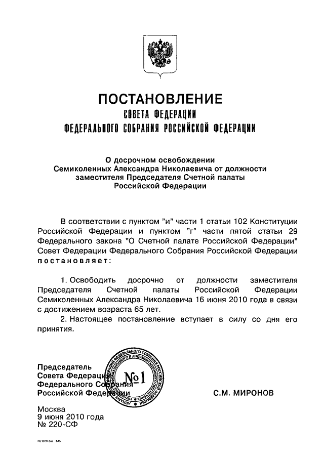"О ДОСРОЧНОМ ОСВОБОЖДЕНИИ СЕМИКОЛЕННЫХ АЛЕКСАНДРА НИКОЛАЕВИЧА ОТ ДОЛЖНОСТИ ЗАМЕСТИТЕЛЯ ПРЕДСЕДАТЕЛЯ СЧЕТНОЙ ПАЛАТЫ РОССИЙСКОЙ ФЕДЕРАЦИИ"
