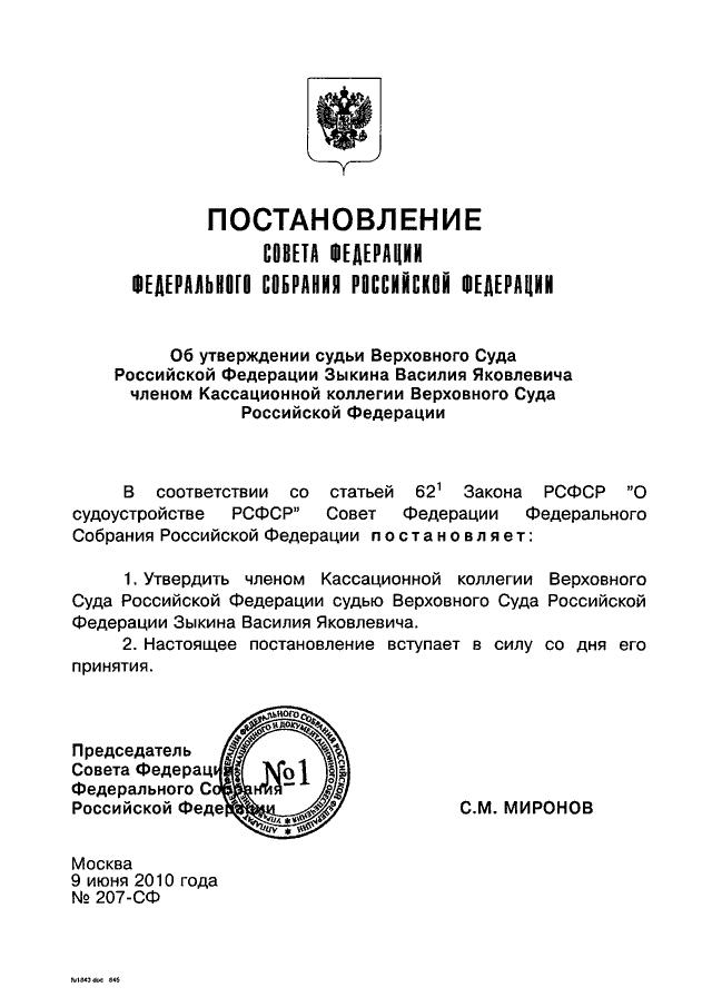 "ОБ УТВЕРЖДЕНИИ СУДЬИ ВЕРХОВНОГО СУДА РОССИЙСКОЙ ФЕДЕРАЦИИ ЗЫКИНА ВАСИЛИЯ ЯКОВЛЕВИЧА ЧЛЕНОМ КАССАЦИОННОЙ КОЛЛЕГИИ ВЕРХОВНОГО СУДА РОССИЙСКОЙ ФЕДЕРАЦИИ"