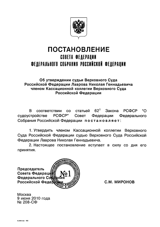 "ОБ УТВЕРЖДЕНИИ СУДЬИ ВЕРХОВНОГО СУДА РОССИЙСКОЙ ФЕДЕРАЦИИ ЛАВРОВА НИКОЛАЯ ГЕННАДЬЕВИЧА ЧЛЕНОМ КАССАЦИОННОЙ КОЛЛЕГИИ ВЕРХОВНОГО СУДА РОССИЙСКОЙ ФЕДЕРАЦИИ"