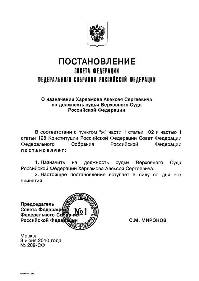 "О НАЗНАЧЕНИИ ХАРЛАМОВА АЛЕКСЕЯ СЕРГЕЕВИЧА НА ДОЛЖНОСТЬ СУДЬИ ВЕРХОВНОГО СУДА РОССИЙСКОЙ ФЕДЕРАЦИИ"