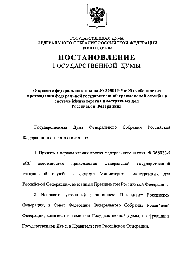 "О ПРОЕКТЕ ФЕДЕРАЛЬНОГО ЗАКОНА N 368023-5 "ОБ ОСОБЕННОСТЯХ ПРОХОЖДЕНИЯ ФЕДЕРАЛЬНОЙ ГОСУДАРСТВЕННОЙ ГРАЖДАНСКОЙ СЛУЖБЫ В СИСТЕМЕ МИНИСТЕРСТВА ИНОСТРАННЫХ ДЕЛ РОССИЙСКОЙ ФЕДЕРАЦИИ"