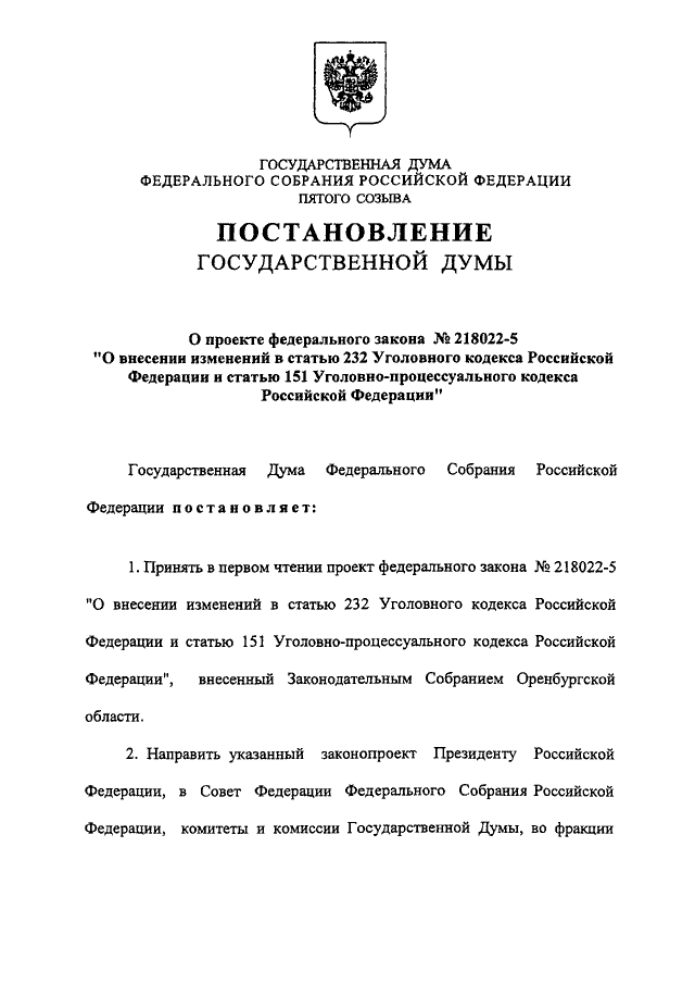 "О ПРОЕКТЕ ФЕДЕРАЛЬНОГО ЗАКОНА N 218022-5 "О ВНЕСЕНИИ ИЗМЕНЕНИЙ В СТАТЬЮ 232 УГОЛОВНОГО КОДЕКСА РОССИЙСКОЙ ФЕДЕРАЦИИ И СТАТЬЮ 151 УГОЛОВНО - ПРОЦЕССУАЛЬНОГО КОДЕКСА РОССИЙСКОЙ ФЕДЕРАЦИИ"