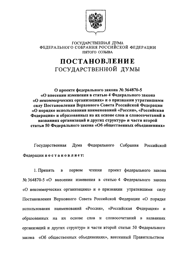 "О ПРОЕКТЕ ФЕДЕРАЛЬНОГО ЗАКОНА N 364870-5 "О ВНЕСЕНИИ ИЗМЕНЕНИЯ В