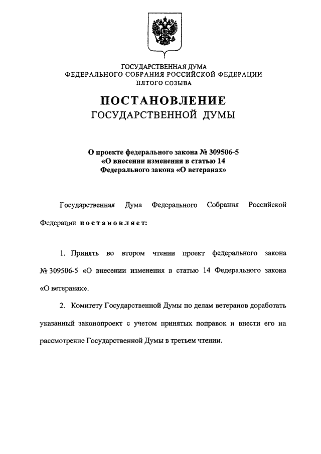 "О ПРОЕКТЕ ФЕДЕРАЛЬНОГО ЗАКОНА N 309506-5 "О ВНЕСЕНИИ ИЗМЕНЕНИЯ В СТАТЬЮ 14 ФЕДЕРАЛЬНОГО ЗАКОНА "О ВЕТЕРАНАХ"