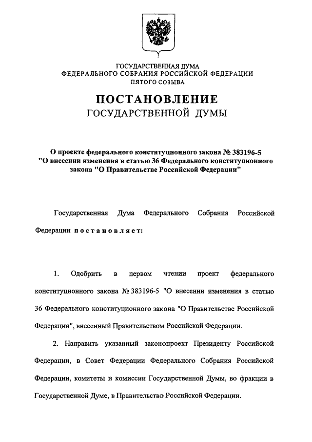 "О ПРОЕКТЕ ФЕДЕРАЛЬНОГО КОНСТИТУЦИОННОГО ЗАКОНА N 383196-5 "О ВНЕСЕНИИ ИЗМЕНЕНИЯ В СТАТЬЮ 36 ФЕДЕРАЛЬНОГО КОНСТИТУЦИОННОГО ЗАКОНА "О ПРАВИТЕЛЬСТВЕ РОССИЙСКОЙ ФЕДЕРАЦИИ"