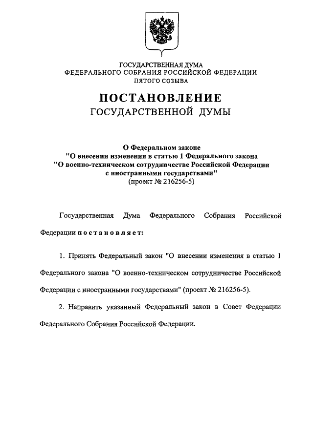 "О ФЕДЕРАЛЬНОМ ЗАКОНЕ "О ВНЕСЕНИИ ИЗМЕНЕНИЯ В СТАТЬЮ 1 ФЕДЕРАЛЬНОГО ЗАКОНА "О ВОЕННО - ТЕХНИЧЕСКОМ СОТРУДНИЧЕСТВЕ РОССИЙСКОЙ ФЕДЕРАЦИИ С ИНОСТРАННЫМИ ГОСУДАРСТВАМИ" (ПРОЕКТ N 216256-5)"