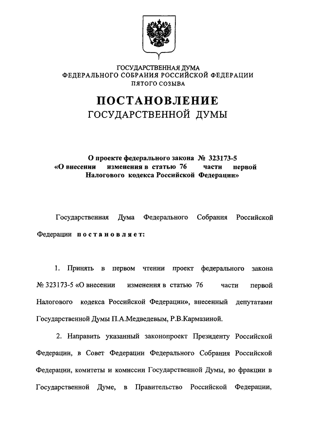 "О ПРОЕКТЕ ФЕДЕРАЛЬНОГО ЗАКОНА N 323173-5 "О ВНЕСЕНИИ ИЗМЕНЕНИЯ В СТАТЬЮ 76 ЧАСТИ ПЕРВОЙ НАЛОГОВОГО КОДЕКСА РОССИЙСКОЙ ФЕДЕРАЦИИ"