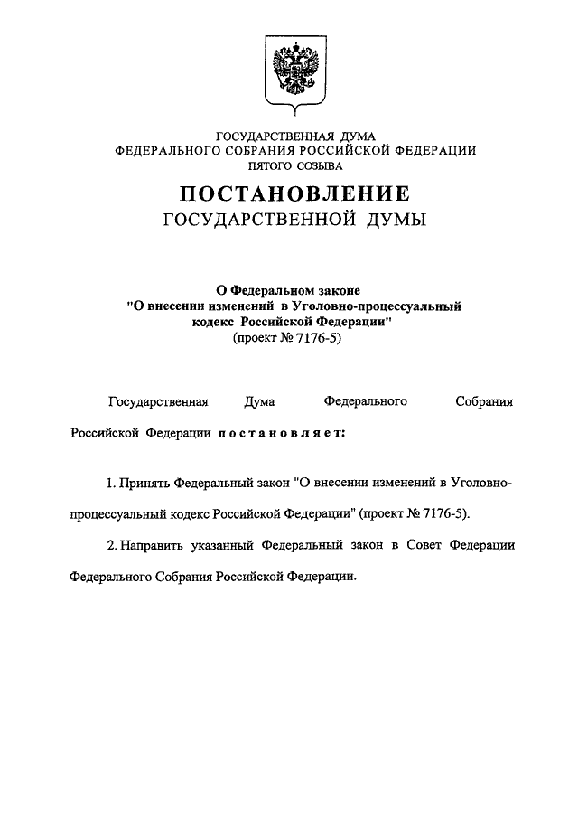 "О ФЕДЕРАЛЬНОМ ЗАКОНЕ "О ВНЕСЕНИИ ИЗМЕНЕНИЙ В УГОЛОВНО - ПРОЦЕССУАЛЬНЫЙ КОДЕКС РОССИЙСКОЙ ФЕДЕРАЦИИ" (ПРОЕКТ N 7176-5)"