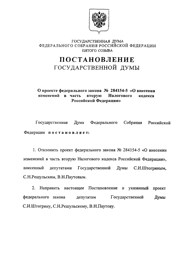 "О ПРОЕКТЕ ФЕДЕРАЛЬНОГО ЗАКОНА N 284154-5 "О ВНЕСЕНИИ ИЗМЕНЕНИЙ В ЧАСТЬ ВТОРУЮ НАЛОГОВОГО КОДЕКСА РОССИЙСКОЙ ФЕДЕРАЦИИ"