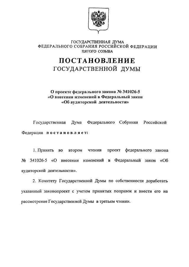 "О ПРОЕКТЕ ФЕДЕРАЛЬНОГО ЗАКОНА N 341026-5 "О ВНЕСЕНИИ ИЗМЕНЕНИЙ В ФЕДЕРАЛЬНЫЙ ЗАКОН "ОБ АУДИТОРСКОЙ ДЕЯТЕЛЬНОСТИ"