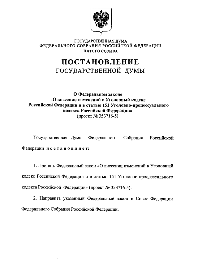"О ФЕДЕРАЛЬНОМ ЗАКОНЕ "О ВНЕСЕНИИ ИЗМЕНЕНИЙ В УГОЛОВНЫЙ КОДЕКС РОССИЙСКОЙ ФЕДЕРАЦИИ И В СТАТЬЮ 151 УГОЛОВНО - ПРОЦЕССУАЛЬНОГО КОДЕКСА РОССИЙСКОЙ ФЕДЕРАЦИИ" (ПРОЕКТ N 353716-5)"