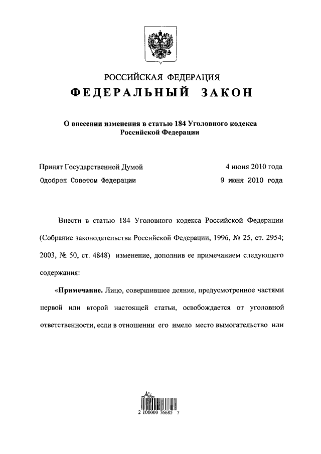 "О ВНЕСЕНИИ ИЗМЕНЕНИЯ В СТАТЬЮ 184 УГОЛОВНОГО КОДЕКСА РОССИЙСКОЙ ФЕДЕРАЦИИ"