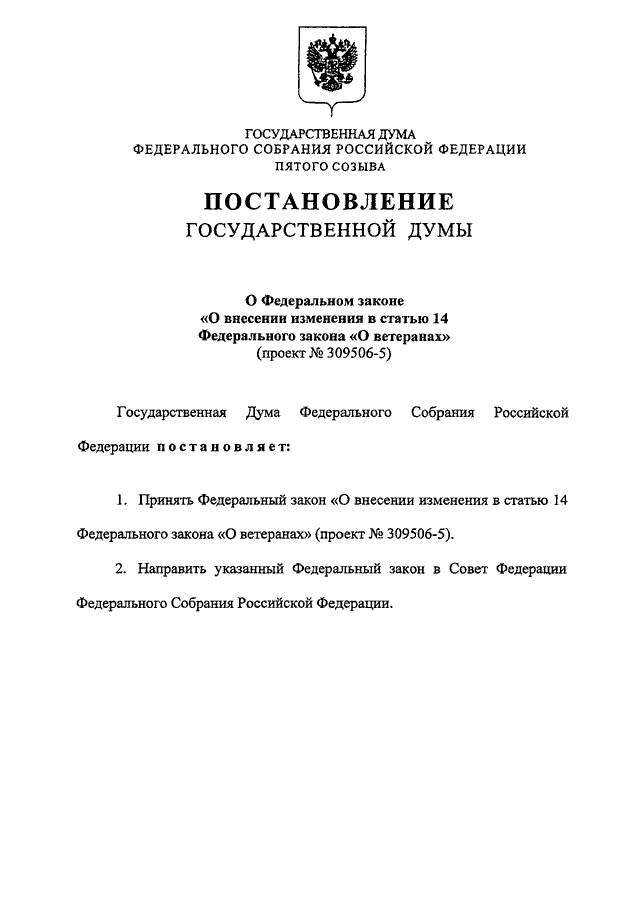 "О ФЕДЕРАЛЬНОМ ЗАКОНЕ "О ВНЕСЕНИИ ИЗМЕНЕНИЯ В СТАТЬЮ 14 ФЕДЕРАЛЬНОГО ЗАКОНА "О ВЕТЕРАНАХ" (ПРОЕКТ N 309506-5)"