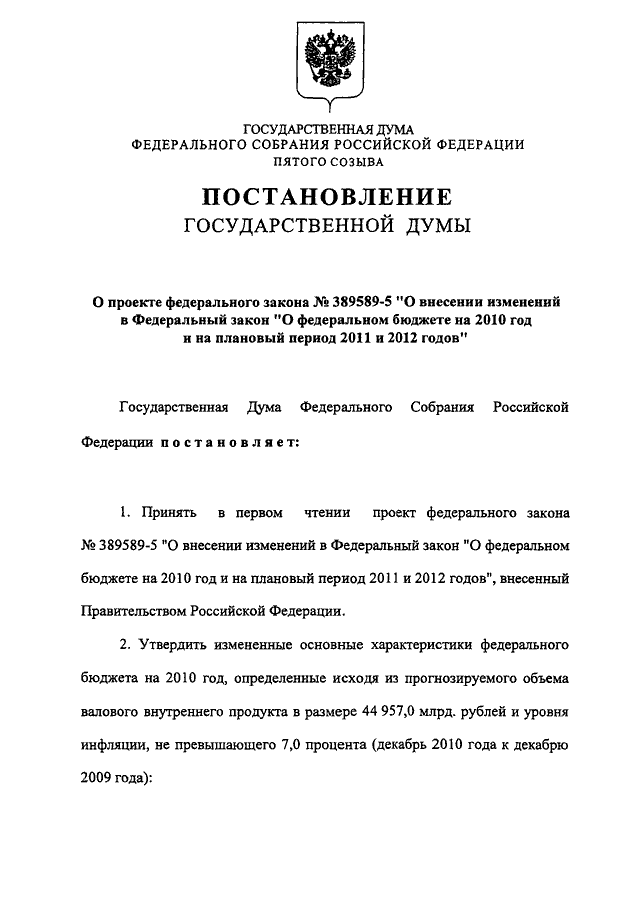 "О ПРОЕКТЕ ФЕДЕРАЛЬНОГО ЗАКОНА N 389589-5 "О ВНЕСЕНИИ ИЗМЕНЕНИЙ В ФЕДЕРАЛЬНЫЙ ЗАКОН "О ФЕДЕРАЛЬНОМ БЮДЖЕТЕ НА 2010 ГОД И НА ПЛАНОВЫЙ ПЕРИОД 2011 И 2012 ГОДОВ"