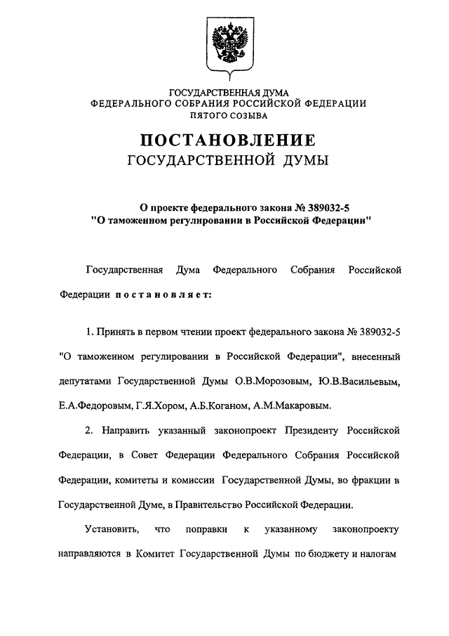 "О ПРОЕКТЕ ФЕДЕРАЛЬНОГО ЗАКОНА N 389032-5 "О ТАМОЖЕННОМ РЕГУЛИРОВАНИИ В РОССИЙСКОЙ ФЕДЕРАЦИИ"