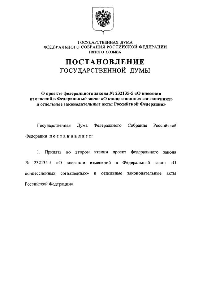 "О ПРОЕКТЕ ФЕДЕРАЛЬНОГО ЗАКОНА N 232135-5 "О ВНЕСЕНИИ ИЗМЕНЕНИЙ В ФЕДЕРАЛЬНЫЙ ЗАКОН "О КОНЦЕССИОННЫХ СОГЛАШЕНИЯХ" И ОТДЕЛЬНЫЕ ЗАКОНОДАТЕЛЬНЫЕ АКТЫ РОССИЙСКОЙ ФЕДЕРАЦИИ"
