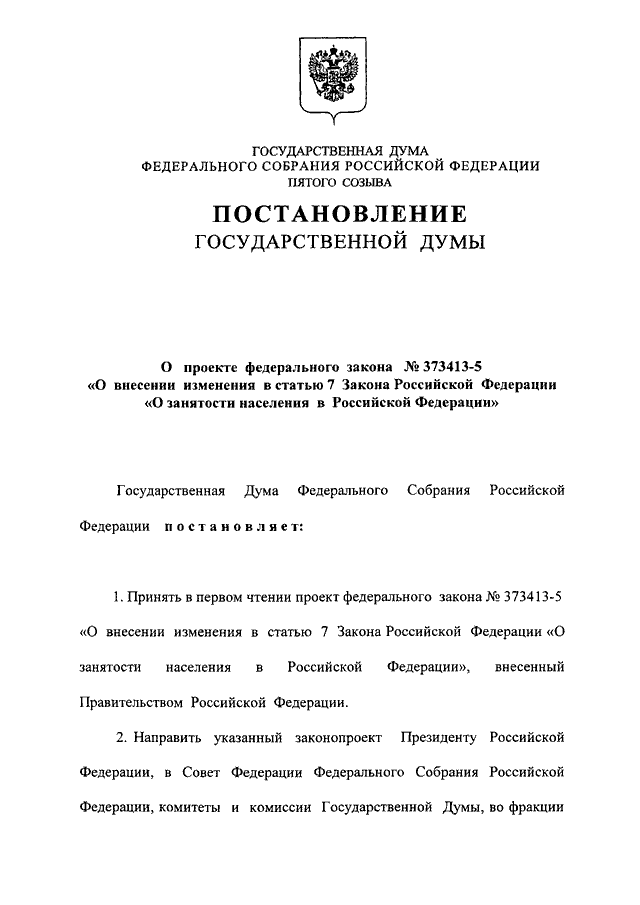 "О ПРОЕКТЕ ФЕДЕРАЛЬНОГО ЗАКОНА N 373413-5 "О ВНЕСЕНИИ ИЗМЕНЕНИЯ В СТАТЬЮ 7 ЗАКОНА РОССИЙСКОЙ ФЕДЕРАЦИИ "О ЗАНЯТОСТИ НАСЕЛЕНИЯ В РОССИЙСКОЙ ФЕДЕРАЦИИ"