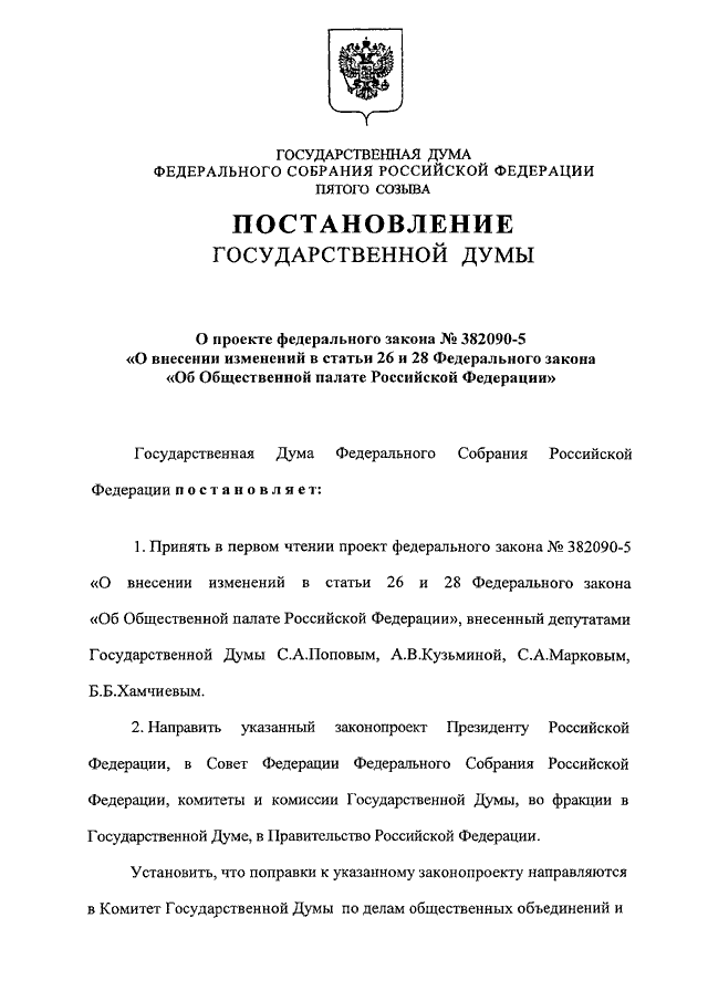 "О ПРОЕКТЕ ФЕДЕРАЛЬНОГО ЗАКОНА N 382090-5 "О ВНЕСЕНИИ ИЗМЕНЕНИЙ В СТАТЬИ 26 И 28 ФЕДЕРАЛЬНОГО ЗАКОНА "ОБ ОБЩЕСТВЕННОЙ ПАЛАТЕ РОССИЙСКОЙ ФЕДЕРАЦИИ"