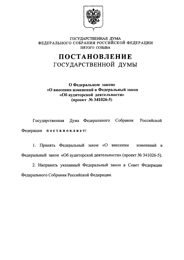 "О ФЕДЕРАЛЬНОМ ЗАКОНЕ "О ВНЕСЕНИИ ИЗМЕНЕНИЙ В ФЕДЕРАЛЬНЫЙ ЗАКОН "ОБ АУДИТОРСКОЙ ДЕЯТЕЛЬНОСТИ" (ПРОЕКТ N 341026-5)"