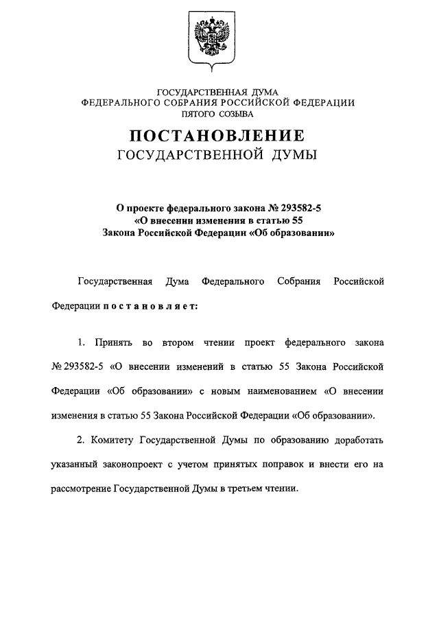 "О ПРОЕКТЕ ФЕДЕРАЛЬНОГО ЗАКОНА N 293582-5 "О ВНЕСЕНИИ ИЗМЕНЕНИЯ В СТАТЬЮ 55 ЗАКОНА РОССИЙСКОЙ ФЕДЕРАЦИИ "ОБ ОБРАЗОВАНИИ"