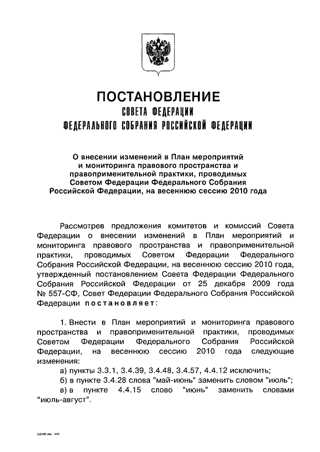 "О ВНЕСЕНИИ ИЗМЕНЕНИЙ В ПЛАН МЕРОПРИЯТИЙ И МОНИТОРИНГА ПРАВОВОГО ПРОСТРАНСТВА И ПРАВОПРИМЕНИТЕЛЬНОЙ ПРАКТИКИ, ПРОВОДИМЫХ СОВЕТОМ ФЕДЕРАЦИИ ФЕДЕРАЛЬНОГО СОБРАНИЯ РОССИЙСКОЙ ФЕДЕРАЦИИ, НА ВЕСЕННЮЮ СЕССИЮ 2010 ГОДА"