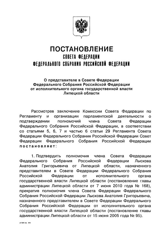 "О ПРЕДСТАВИТЕЛЕ В СОВЕТЕ ФЕДЕРАЦИИ ФЕДЕРАЛЬНОГО СОБРАНИЯ РОССИЙСКОЙ ФЕДЕРАЦИИ ОТ ИСПОЛНИТЕЛЬНОГО ОРГАНА ГОСУДАРСТВЕННОЙ ВЛАСТИ ЛИПЕЦКОЙ ОБЛАСТИ"