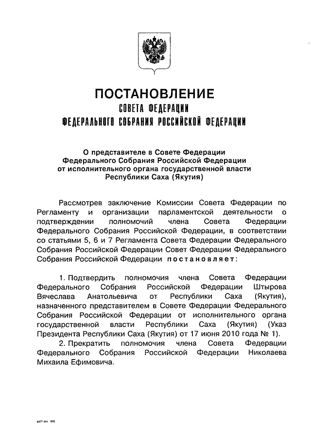 "О ПРЕДСТАВИТЕЛЕ В СОВЕТЕ ФЕДЕРАЦИИ ФЕДЕРАЛЬНОГО СОБРАНИЯ РОССИЙСКОЙ ФЕДЕРАЦИИ ОТ ИСПОЛНИТЕЛЬНОГО ОРГАНА ГОСУДАРСТВЕННОЙ ВЛАСТИ РЕСПУБЛИКИ САХА (ЯКУТИЯ)"