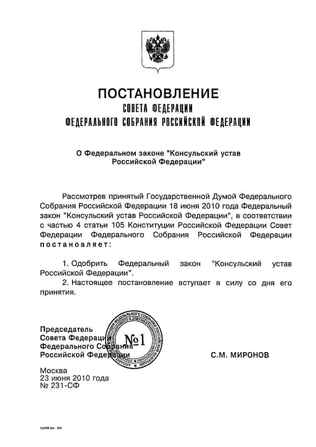 ПОСТАНОВЛЕНИЕ СФ ФС РФ от 23.06.2010 N 231-СФ