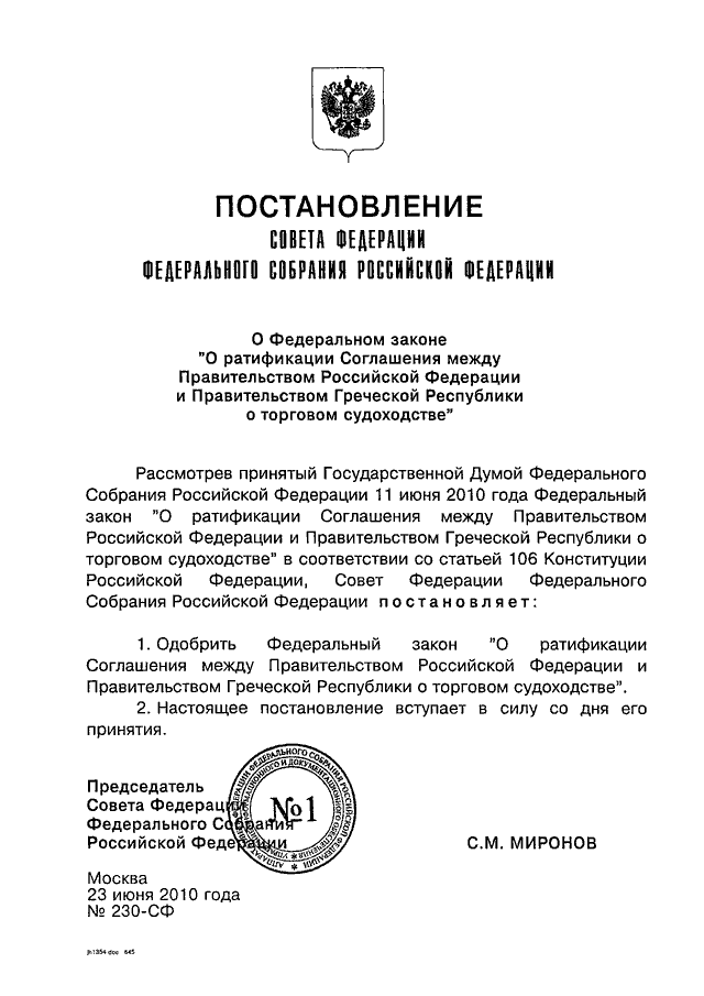 ПОСТАНОВЛЕНИЕ СФ ФС РФ от 23.06.2010 N 230-СФ