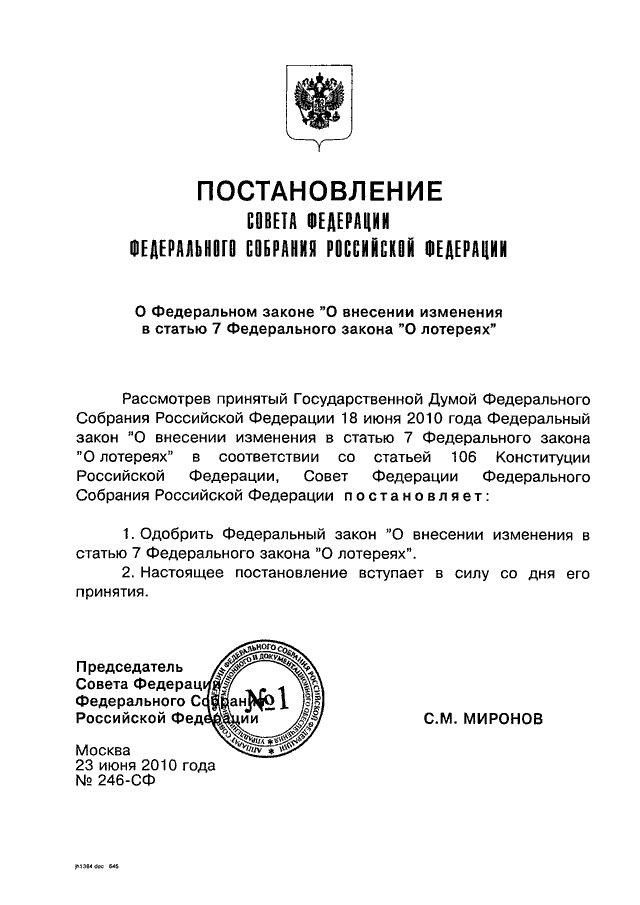 ПОСТАНОВЛЕНИЕ СФ ФС РФ от 23.06.2010 N 246-СФ