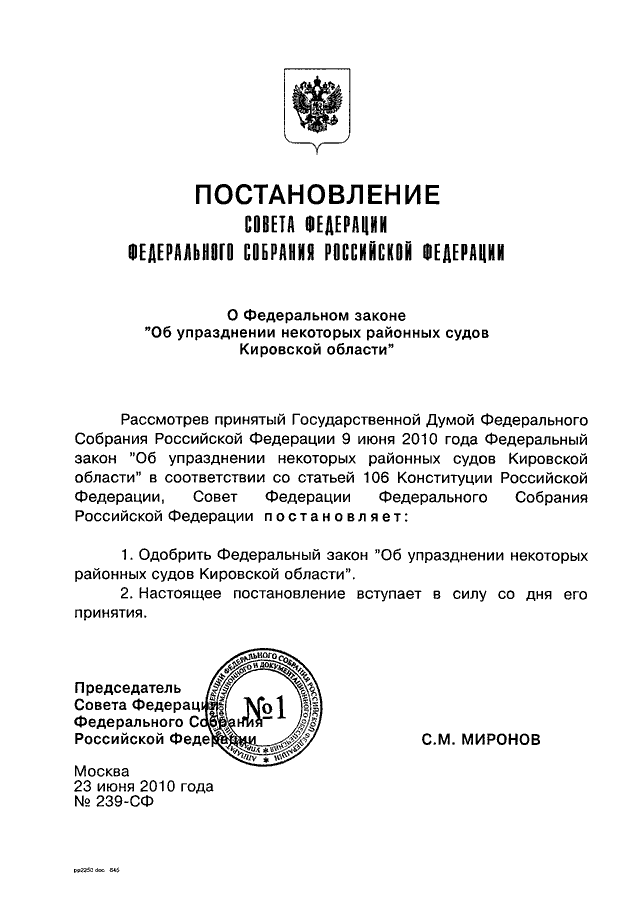 ПОСТАНОВЛЕНИЕ СФ ФС РФ от 23.06.2010 N 239-СФ