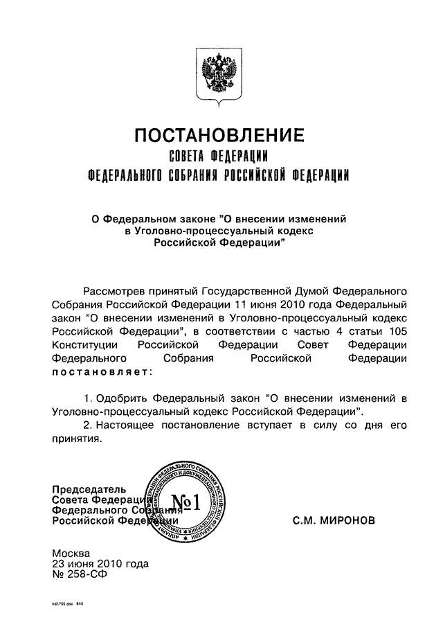 ПОСТАНОВЛЕНИЕ СФ ФС РФ от 23.06.2010 N 258-СФ