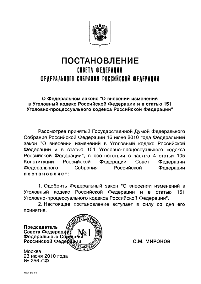 ПОСТАНОВЛЕНИЕ СФ ФС РФ от 23.06.2010 N 256-СФ