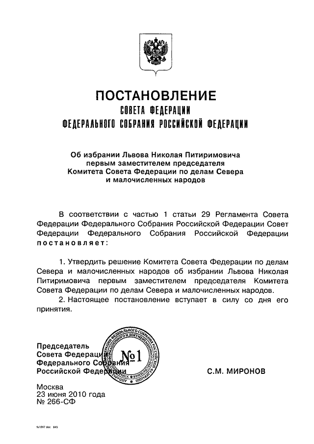 "ОБ ИЗБРАНИИ ЛЬВОВА НИКОЛАЯ ПИТИРИМОВИЧА ПЕРВЫМ ЗАМЕСТИТЕЛЕМ ПРЕДСЕДАТЕЛЯ КОМИТЕТА СОВЕТА ФЕДЕРАЦИИ ПО ДЕЛАМ СЕВЕРА И МАЛОЧИСЛЕННЫХ НАРОДОВ"