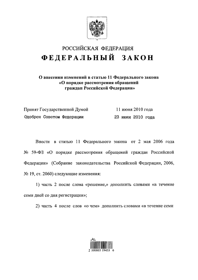 "О ВНЕСЕНИИ ИЗМЕНЕНИЙ В СТАТЬЮ 11 ФЕДЕРАЛЬНОГО ЗАКОНА "О ПОРЯДКЕ РАССМОТРЕНИЯ ОБРАЩЕНИЙ ГРАЖДАН РОССИЙСКОЙ ФЕДЕРАЦИИ"