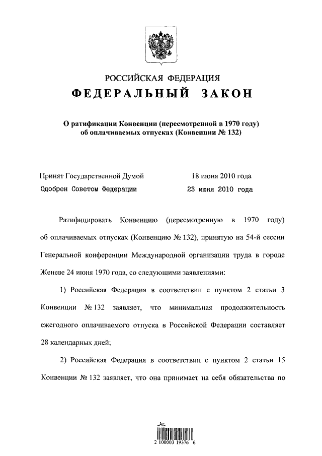 "О РАТИФИКАЦИИ КОНВЕНЦИИ (ПЕРЕСМОТРЕННОЙ В 1970 ГОДУ) ОБ ОПЛАЧИВАЕМЫХ ОТПУСКАХ (КОНВЕНЦИИ N 132)"