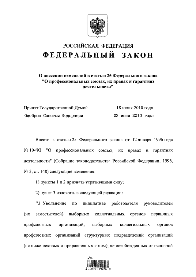 "О ВНЕСЕНИИ ИЗМЕНЕНИЙ В СТАТЬЮ 25 ФЕДЕРАЛЬНОГО ЗАКОНА "О ПРОФЕССИОНАЛЬНЫХ СОЮЗАХ, ИХ ПРАВАХ И ГАРАНТИЯХ ДЕЯТЕЛЬНОСТИ"