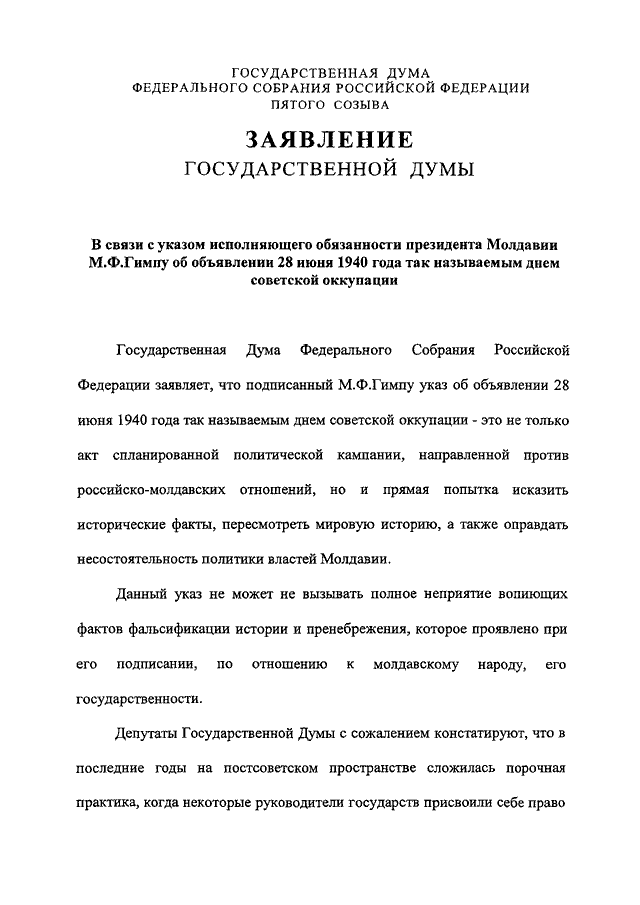 "О ЗАЯВЛЕНИИ ГОСУДАРСТВЕННОЙ ДУМЫ ФЕДЕРАЛЬНОГО СОБРАНИЯ РОССИЙСКОЙ ФЕДЕРАЦИИ "В СВЯЗИ С УКАЗОМ ИСПОЛНЯЮЩЕГО ОБЯЗАННОСТИ ПРЕЗИДЕНТА МОЛДАВИИ М.Ф. ГИМПУ ОБ ОБЪЯВЛЕНИИ 28 ИЮНЯ 1940 ГОДА ТАК НАЗЫВАЕМЫМ ДНЕМ СОВЕТСКОЙ ОККУПАЦИИ"