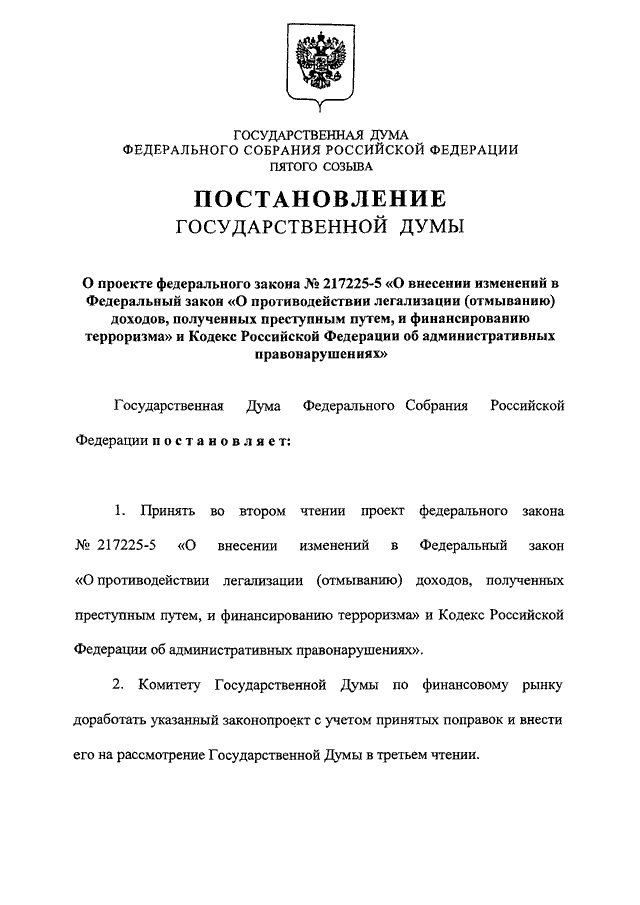 "О ПРОЕКТЕ ФЕДЕРАЛЬНОГО ЗАКОНА N 217225-5 "О ВНЕСЕНИИ ИЗМЕНЕНИЙ В ФЕДЕРАЛЬНЫЙ ЗАКОН "О ПРОТИВОДЕЙСТВИИ ЛЕГАЛИЗАЦИИ (ОТМЫВАНИЮ) ДОХОДОВ, ПОЛУЧЕННЫХ ПРЕСТУПНЫМ ПУТЕМ, И ФИНАНСИРОВАНИЮ ТЕРРОРИЗМА" И КОДЕКС РОССИЙСКОЙ ФЕДЕРАЦИИ ОБ АДМИНИСТРАТИВНЫХ ПРАВОНАРУШЕНИЯХ"