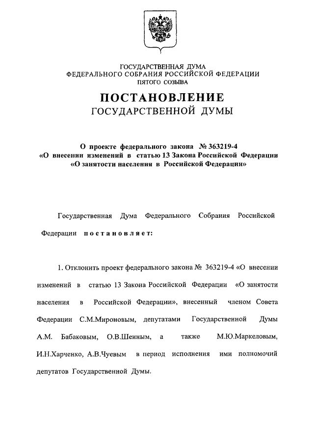 "О ПРОЕКТЕ ФЕДЕРАЛЬНОГО ЗАКОНА N 363219-4 "О ВНЕСЕНИИ ИЗМЕНЕНИЙ В СТАТЬЮ 13 ЗАКОНА РОССИЙСКОЙ ФЕДЕРАЦИИ "О ЗАНЯТОСТИ НАСЕЛЕНИЯ В РОССИЙСКОЙ ФЕДЕРАЦИИ"