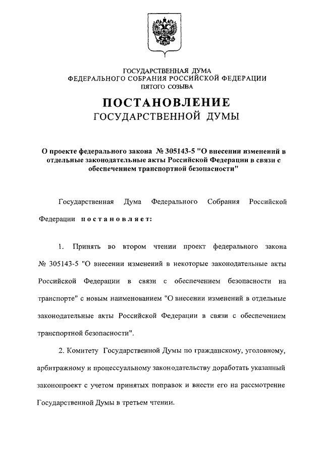 "О ПРОЕКТЕ ФЕДЕРАЛЬНОГО ЗАКОНА N 305143-5 "О ВНЕСЕНИИ ИЗМЕНЕНИЙ В ОТДЕЛЬНЫЕ ЗАКОНОДАТЕЛЬНЫЕ АКТЫ РОССИЙСКОЙ ФЕДЕРАЦИИ В СВЯЗИ С ОБЕСПЕЧЕНИЕМ ТРАНСПОРТНОЙ БЕЗОПАСНОСТИ"