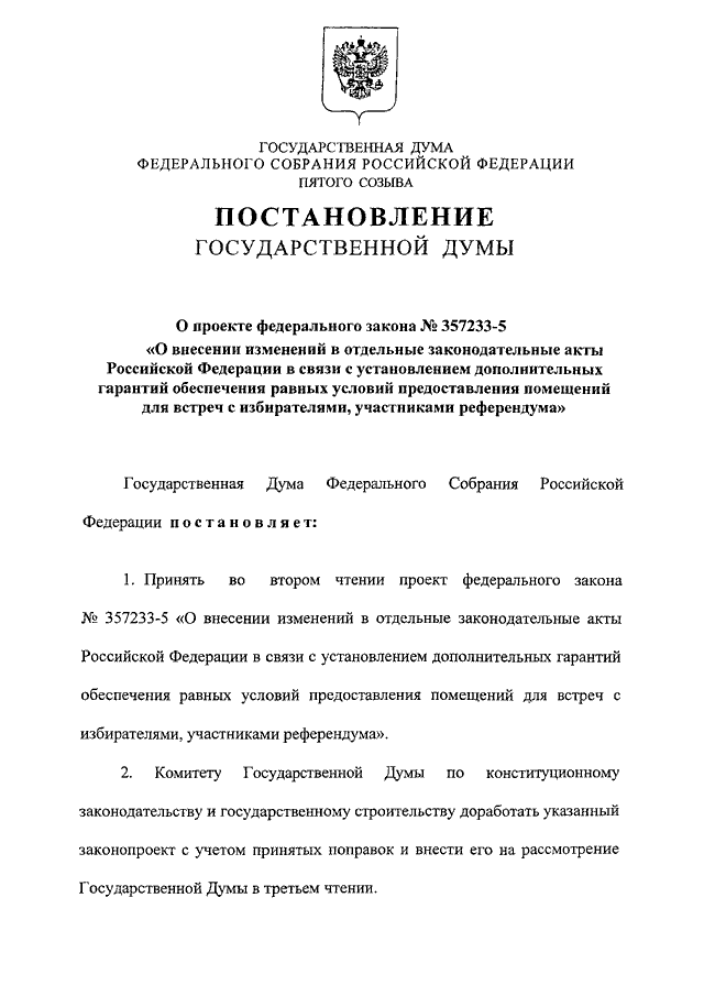 "О ПРОЕКТЕ ФЕДЕРАЛЬНОГО ЗАКОНА N 357233-5 "О ВНЕСЕНИИ ИЗМЕНЕНИЙ В ОТДЕЛЬНЫЕ ЗАКОНОДАТЕЛЬНЫЕ АКТЫ РОССИЙСКОЙ ФЕДЕРАЦИИ В СВЯЗИ С УСТАНОВЛЕНИЕМ ДОПОЛНИТЕЛЬНЫХ ГАРАНТИЙ ОБЕСПЕЧЕНИЯ РАВНЫХ УСЛОВИЙ ПРЕДОСТАВЛЕНИЯ ПОМЕЩЕНИЙ ДЛЯ ВСТРЕЧ С ИЗБИРАТЕЛЯМИ, УЧАСТНИКАМИ РЕФЕРЕНДУМА"