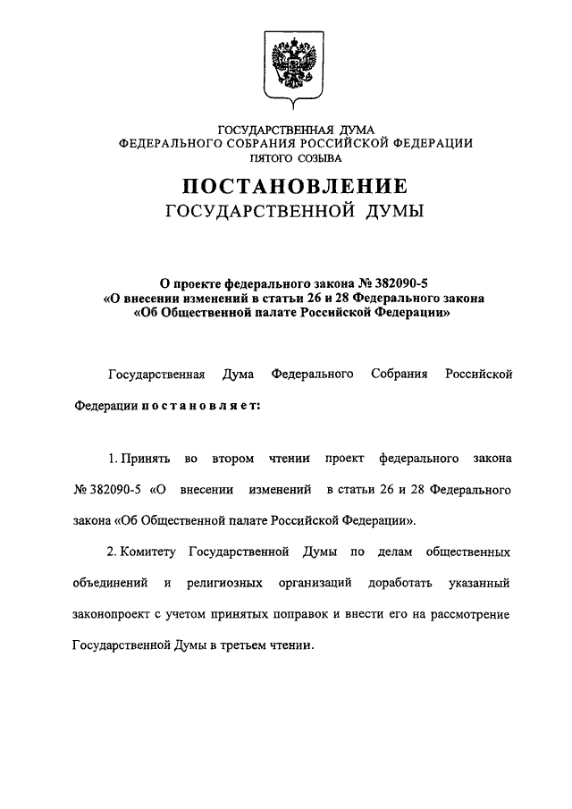 "О ПРОЕКТЕ ФЕДЕРАЛЬНОГО ЗАКОНА N 382090-5 "О ВНЕСЕНИИ ИЗМЕНЕНИЙ В СТАТЬИ 26 И 28 ФЕДЕРАЛЬНОГО ЗАКОНА "ОБ ОБЩЕСТВЕННОЙ ПАЛАТЕ РОССИЙСКОЙ ФЕДЕРАЦИИ"