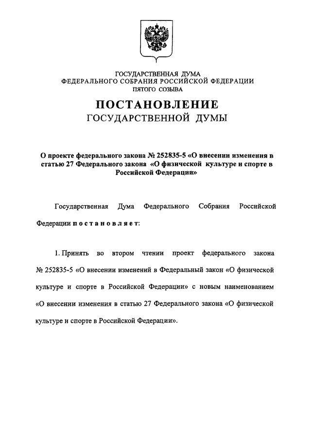 "О ПРОЕКТЕ ФЕДЕРАЛЬНОГО ЗАКОНА N 252835-5 "О ВНЕСЕНИИ ИЗМЕНЕНИЯ В СТАТЬЮ 27 ФЕДЕРАЛЬНОГО ЗАКОНА "О ФИЗИЧЕСКОЙ КУЛЬТУРЕ И СПОРТЕ В РОССИЙСКОЙ ФЕДЕРАЦИИ"