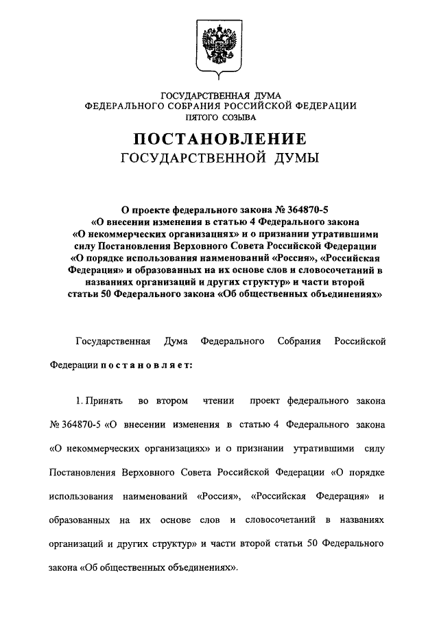 "О ПРОЕКТЕ ФЕДЕРАЛЬНОГО ЗАКОНА N 364870-5 "О ВНЕСЕНИИ ИЗМЕНЕНИЯ В