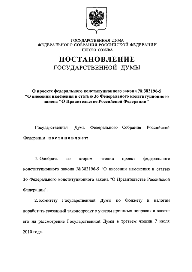 "О ПРОЕКТЕ ФЕДЕРАЛЬНОГО КОНСТИТУЦИОННОГО ЗАКОНА N 383196-5 "О ВНЕСЕНИИ ИЗМЕНЕНИЯ В СТАТЬЮ 36 ФЕДЕРАЛЬНОГО КОНСТИТУЦИОННОГО ЗАКОНА "О ПРАВИТЕЛЬСТВЕ РОССИЙСКОЙ ФЕДЕРАЦИИ"