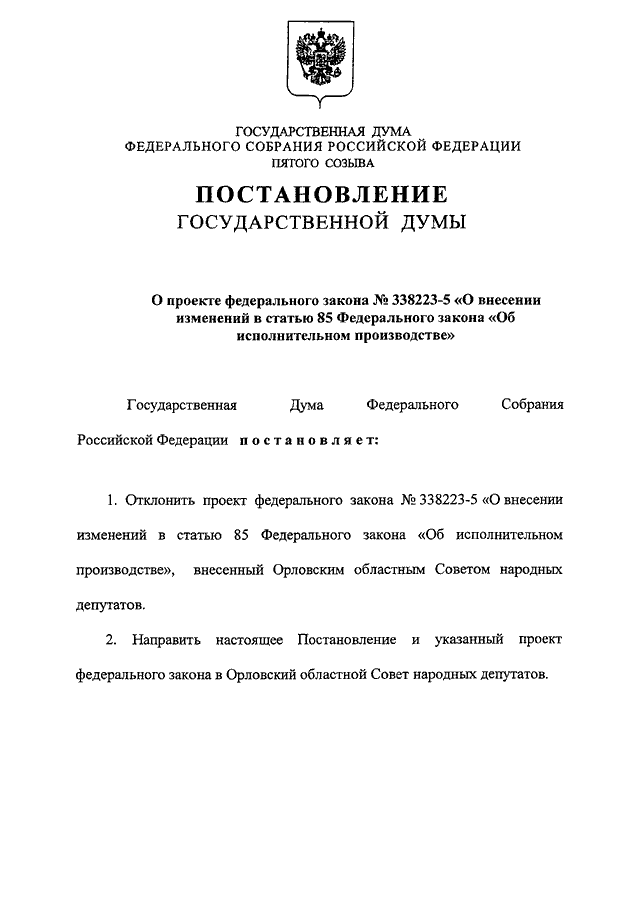 "О ПРОЕКТЕ ФЕДЕРАЛЬНОГО ЗАКОНА N 338223-5 "О ВНЕСЕНИИ ИЗМЕНЕНИЙ В СТАТЬЮ 85 ФЕДЕРАЛЬНОГО ЗАКОНА "ОБ ИСПОЛНИТЕЛЬНОМ ПРОИЗВОДСТВЕ"