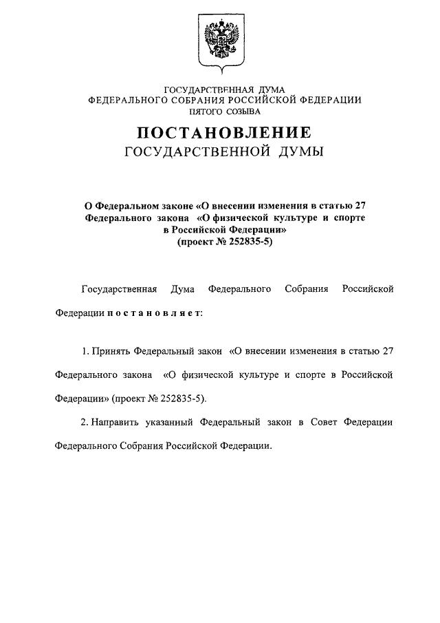 "О ФЕДЕРАЛЬНОМ ЗАКОНЕ "О ВНЕСЕНИИ ИЗМЕНЕНИЯ В СТАТЬЮ 27 ФЕДЕРАЛЬНОГО ЗАКОНА "О ФИЗИЧЕСКОЙ КУЛЬТУРЕ И СПОРТЕ В РОССИЙСКОЙ ФЕДЕРАЦИИ" (ПРОЕКТ N 252835-5)"