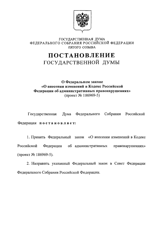 "О ФЕДЕРАЛЬНОМ ЗАКОНЕ "О ВНЕСЕНИИ ИЗМЕНЕНИЙ В КОДЕКС РОССИЙСКОЙ ФЕДЕРАЦИИ ОБ АДМИНИСТРАТИВНЫХ ПРАВОНАРУШЕНИЯХ" (ПРОЕКТ N 186969-5)"